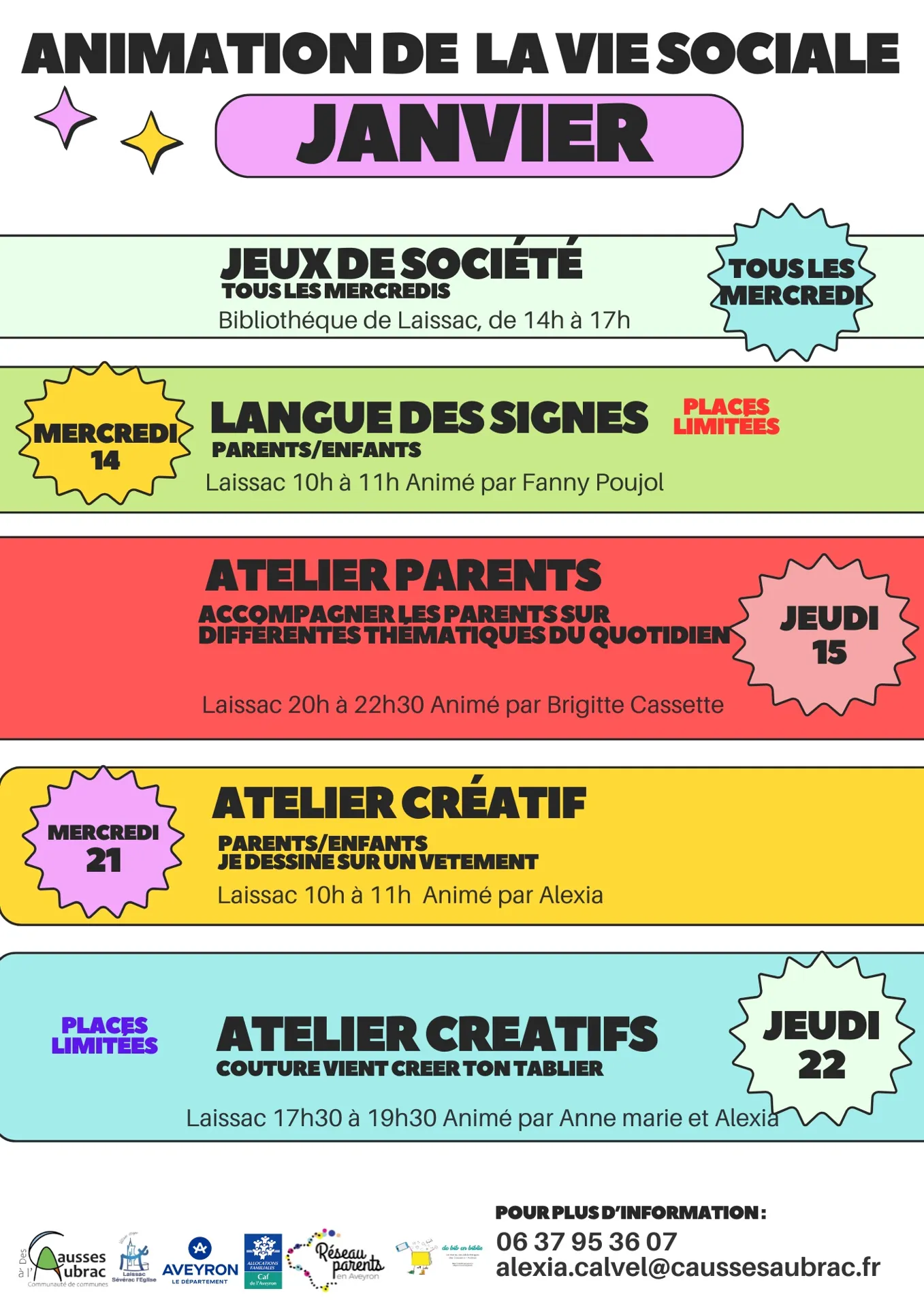 Voici le programme des animations de la vie sociale du mois de Janvier sur le Laissagais. Au programme : Des temps ludique, Animations pour les familles un atelier créatif pour les petits et les grands, Ateliers parents (groupe de parole), …