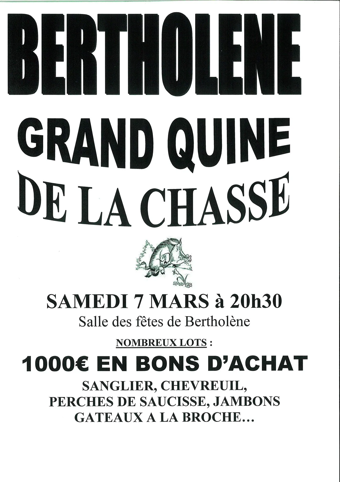 Quine de la Société de chasse de Bertholène à partir de 20h30 à la salle des fêtes de Bertholène.