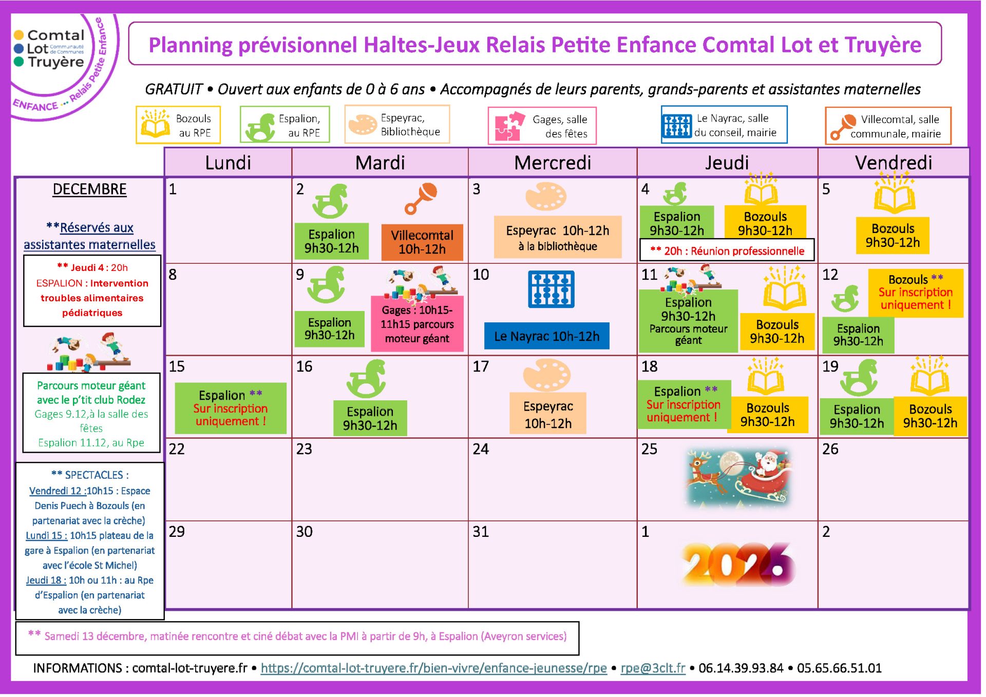 Planning prévisionnel Haltes-Jeux Relais Petite Enfance décembre 2025