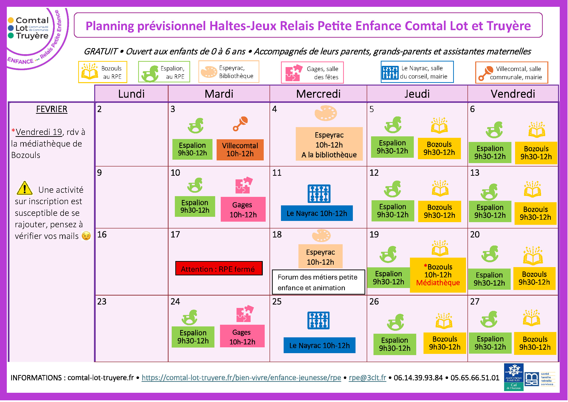 Planning prévisionnel Haltes Jeux Relais Petite Enfance février